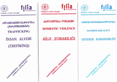 "Trafficking in Women ". Objective to investigate the problem of Trafficking in women from Georgia,carry out the social questioning among the suppositional groups of heightened risk in Georgia; analyse the Georgian legislation., collect the materials of research on problem in other countries; give the information to the women from group heightened risk and to public of Georgia. The analysis show the problem of trafficking in Georgia is existing in an obscured form.(OSI) Establishment of Network of Women’s Rights in region of Georgia Goals-create network of women’s right in the regions Kakheti, Guria, Shida- Kartly of Georgia. To reach this target, we plan though seminar-training in the regional centers and for the participants to establish local branches. (ABA)